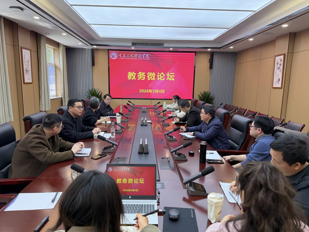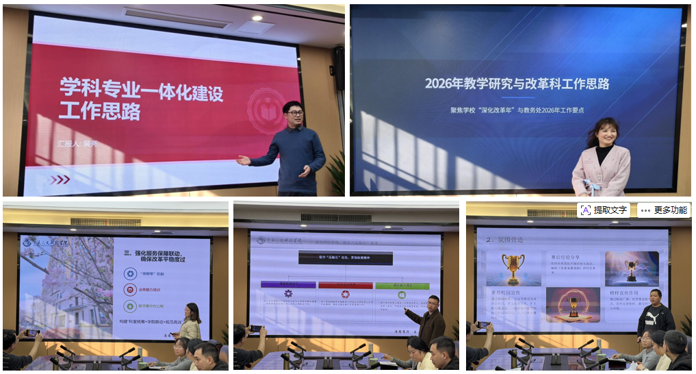 本次微论坛紧扣学校教学工作核心,各科室负责人立足岗位职责,围绕2026年教务处工作要点,分别就学科专业一体化建设、教学研究与改革、教学运行管理等五大主题作专题分享。分享中,各负责人结合工作实际,梳理推进情况、明确后续举措,内容务实、重点突出。全体参会人员认真聆听、积极互动,围绕重难点问题深入研讨,在思想碰撞中凝聚共识、互学互鉴,实现了共同提升的活动目标。